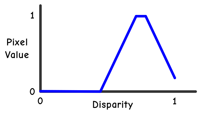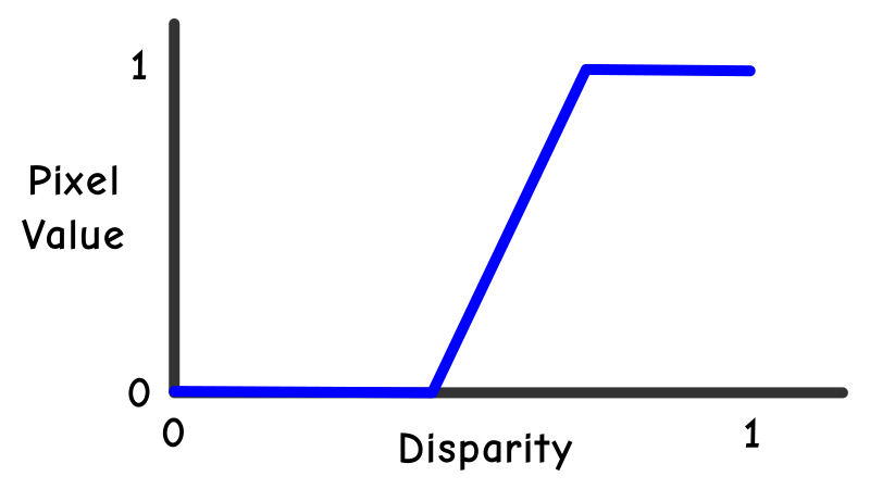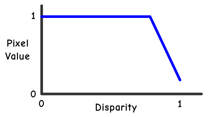 Nó có nghĩa là pixel trắng nhất (giá trị 1.0) sẽ là điểm đó với chênh lệch disparity là 0.75 ± 0.05 (tiêu điểm ± chiều rộng / 2). Điểm pixcelsau đó sẽ nhanh chóng mờ thành màu đen cho giá trị chênh lệch bên trên và dưới khoảng này. Dốc càng lớn thì nó càng nhanh chóng mờ thành màu đen.