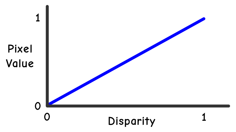 Giá trị pixel của depth map image của bạn sẽ bằng với chênh lệch disparity thông thường. Nhớ rằng, một giá trị pixel của 1.0 là màu trắng, và giá trị một chênh lệch disparity của 1.0 thì gần với camera nhất. Trong mặt khác của scale, một giá trị pixel của 0.0 là màu đen, và giá trị một chênh lệch disparity của 0.0 thì xa camera nhất.