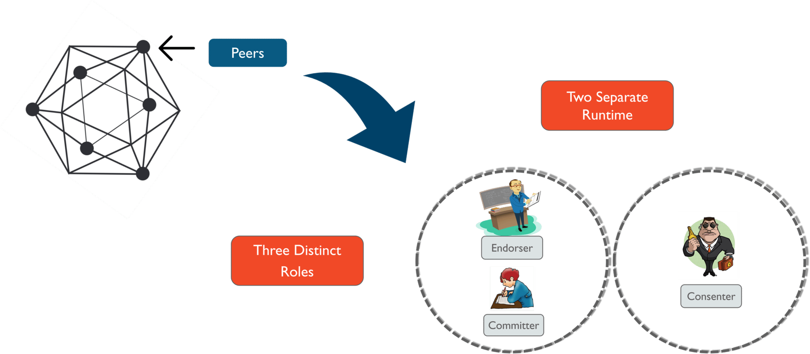 Tất cả điều này được thực hiện nhờ kiến trúc mô đun của Hyperledger, nó làm cho các cơ chế như thuật toán đồng thuật trở thành một tính năng có thể tùy biến (plug-and-play). Trong kiến trúc này, những đăc điểm đáng chú ý nhất được thể hiện trong các peer của mạng. Các peer đã được chia thành ba vai trò riêng biệt, đó là: