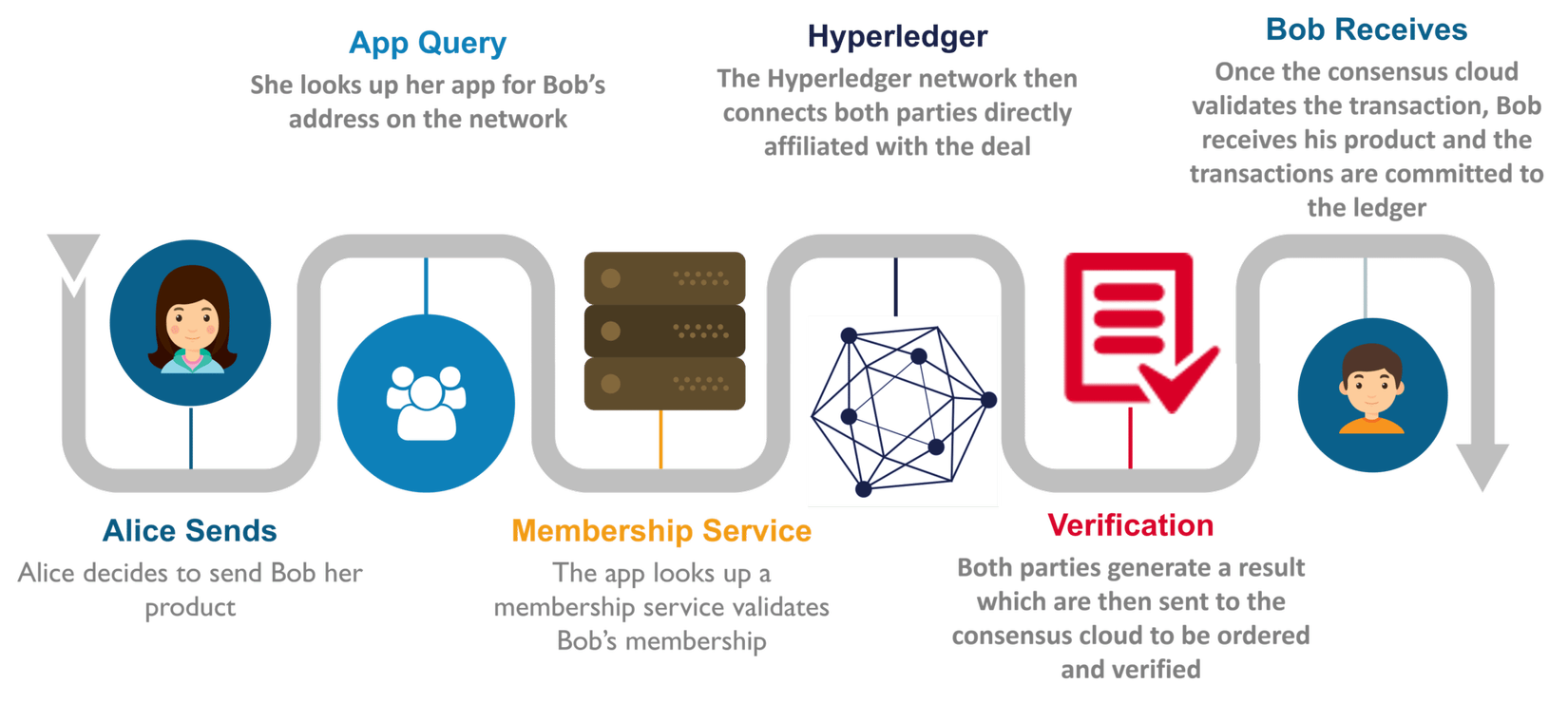 Giả sử Alice và Bob thực hiện giao dịch đặc biệt của họ trên mạng Hyperledger, cô sẽ tìm kiếm Bob thông qua một ứng dụng truy vấn danh sách các thành viên tham gia vào mạng. Sau khi đã được xác thực, hai peer sẽ được kết nối và kết quả được trả về. Trong thỏa thuận hai bên này, cả hai kết quả trả về phải giống nhau để giao dịch có thể được xác nhận. Trong các giao dịch khác với nhiều bên, nhiều quy tắc hơn có thể được áp dụng.