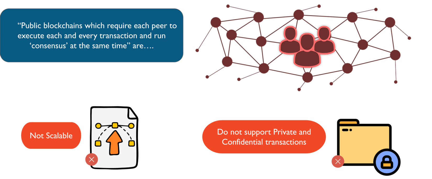 Trong quá trình thử nghiệm, các nhà phát triển nhận ra rằng trong các mạng blockchain, khi các peer trong mạng cần xác thực từng giao dịch và thực hiện cơ chế đồng thuận cùng một lúc, nó sẽ ảnh hưởng rất lớn đến khả năng mở rộng (scale). Các giao dịch cần đảm bảo tính riêng tư, bảo mật (confidentiality) không phù hợp để thực hiện trên các mạng public blockchain.