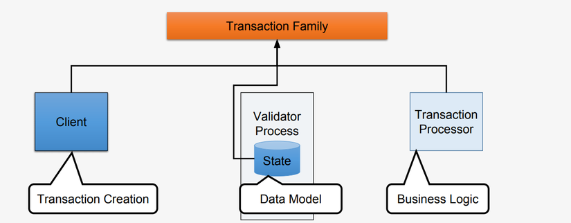 Trong một ứng dụng Sawtooth, mô hình dữ liệu và ngôn ngữ giao dịch được triển khai trong một transaction family, được chạy trên Sawtooth node như một bộ xử lý giao dịch.