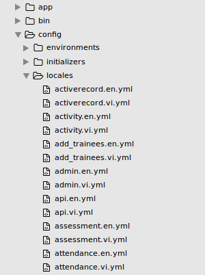 Các bạn sẽ thấy project rails có folder "/config/locales". Trong folder này sẽ chứa các file bản dịch ngôn ngữ của app (*.yml, *.rb). Mặc định sẽ luôn có 1 file mẫu có tên là "en.yml" - chỉ ra ngôn ngữ sử dụng là English.