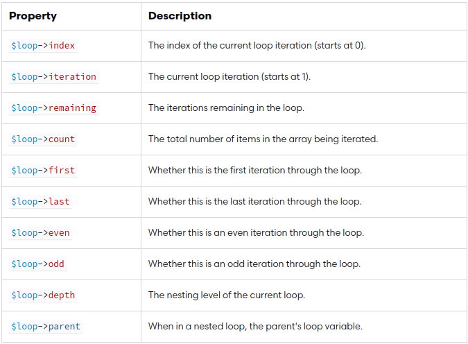 Blade còn cung cấp cho chúng ta 1 tính năng khi làm việc với các cấu trúc vòng lặp đó là biến $loop. Biến này cung cấp cho chúng ta 1 số thông tin hữu ích như current loop index hay đây có phải phần tử first hay las trong vòng lặp