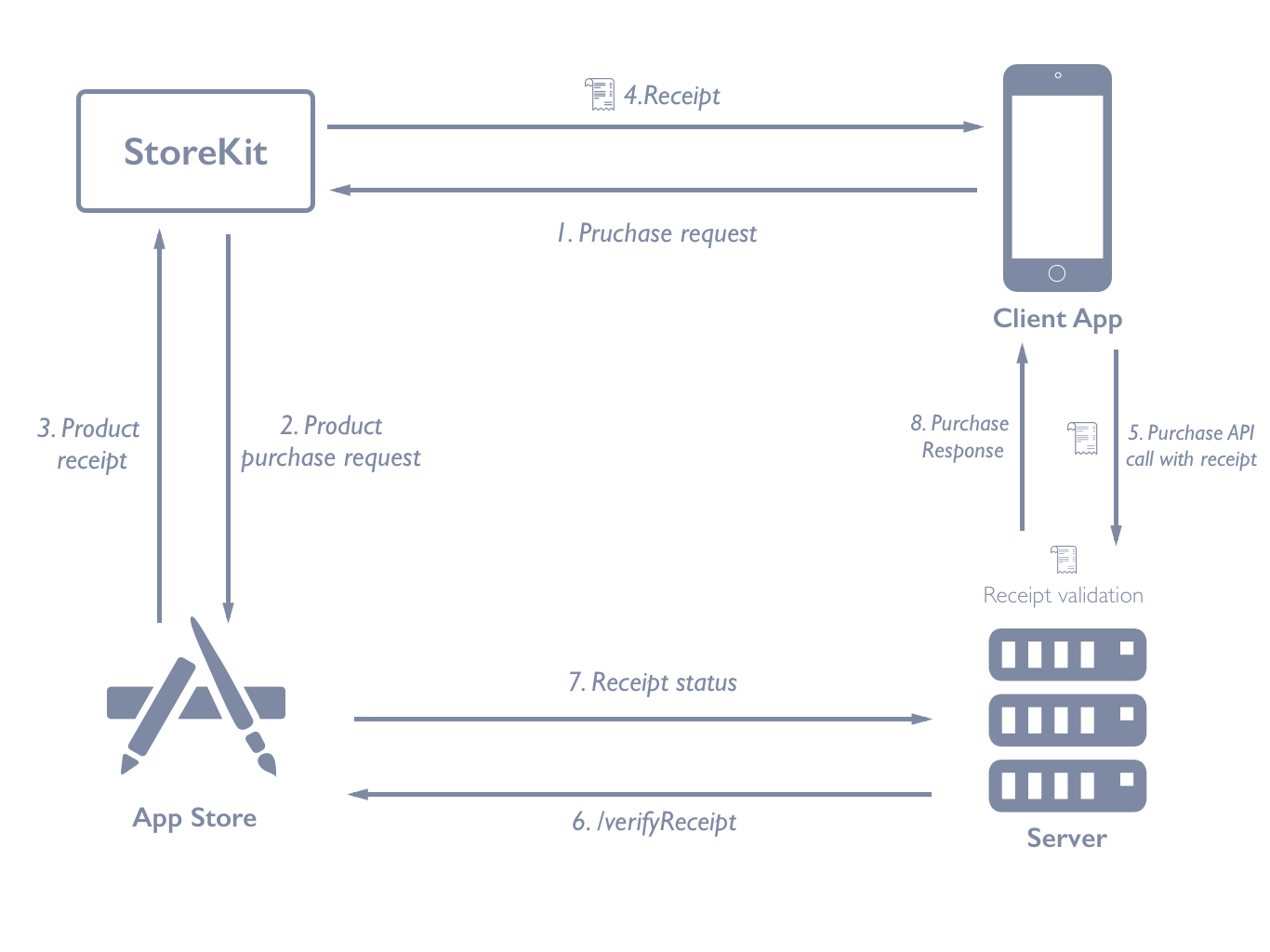 Bạn đã thanh toán xong, bây giờ bạn lấy thông tin thanh toán từ App Store, chính là receipt. Sau khi bạn nhận được receipt, bạn gửi reciept này lên server (bước 5) để phân tích và xác thực (bước 6, 7). Bạn có thể xem phần validate receipt ở đây: https://developer.apple.com/library/archive/releasenotes/General/ValidateAppStoreReceipt/Chapters/ValidateRemotely.html#//apple_ref/doc/uid/TP40010573-CH104-SW1. Việc xử lý hoá đơn trên server đáng tin cậy hơn vì việc debug và xử lý vấn đề user là khả thi hơn.