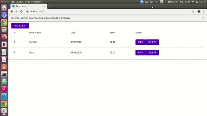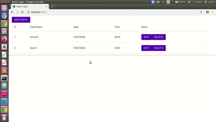Bạn có thể thấy rằng trước đó khi chúng tôi thêm một sự kiện mới vào thời điểm đó, chúng tôi phải làm mới trang mỗi lần. Nhưng bây giờ trong GIF ở trên, bạn có thể thấy rằng chúng tôi không phải làm mới trang. Khi chúng tôi thêm dữ liệu và nhấp vào nút gửi, dữ liệu của chúng tôi sẽ được phản ánh ngay lập tức. Đó là cách chúng tôi cập nhật trạng thái bằng cách sử dụng state và mảng hiện tại. Bây giờ chúng ta sẽ xem cách thực hiện thao tác chỉnh sửa và xóa sự kiện.