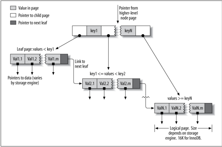 - Ý tưởng chung của B-Tree là lưu trữ các giá trị được sắp xếp, mỗi leaf node có độ cao bằng nhau tính từ gốc. B-Tree có thể tăng tốc truy vấn vì storage engine không cần tìm toàn bộ bản ghi của bảng. Thay vào đó, nó sẽ tìm từ node root, root sẽ chứa con trỏ tới node con, storeage engine sẽ dựa vào con trỏ đó. Nó tìm đúng con trỏ bằng cách xét giá trị của node pages, nơi chứa khoảng giá trị của các node con. Cuối cùng, storage engine chỉ ra rằng giá trị không tồn tại hoặc tìm được giá trị ở leaf node.