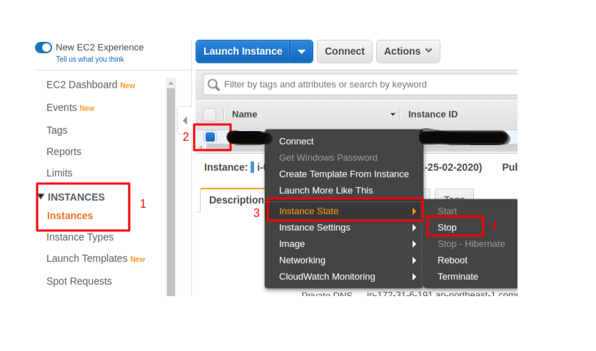 Services -> EC2 -> Instances, chọn instance cần upgrade storage. Chọn instance state > stop.