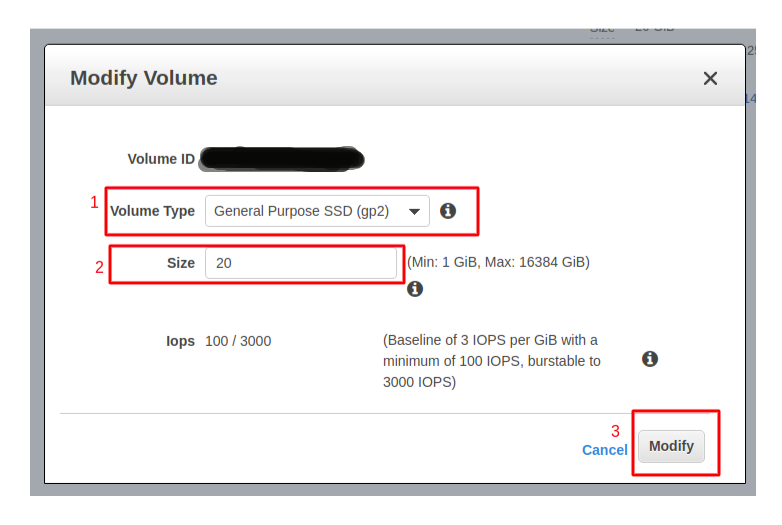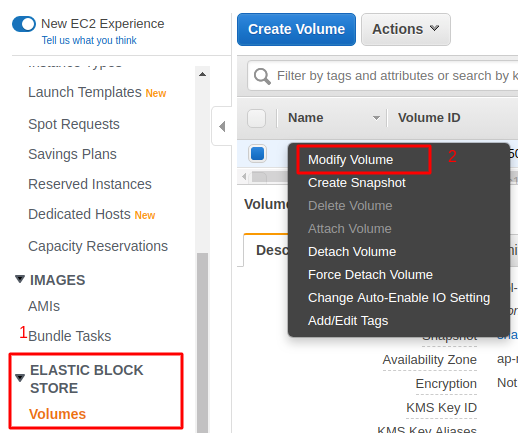 Elastic Block Store -> Volumes, chọn volumes của instance cần upgrade storage. Chọn Modify.