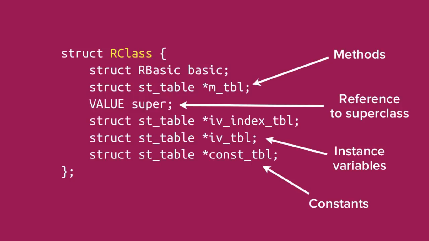 Những thành phần chính trong một class Ruby là các table chứa methods, instance variables và constants, chúng lần lượt có tên là m_tbl, iv_tbl và const_tbl. Một điều đặc biệt đó là class hay bất cứ đối tượng nào của Ruby đều có một cấu trúc có tên là RBasic. Cấu trúc này rất đơn giản