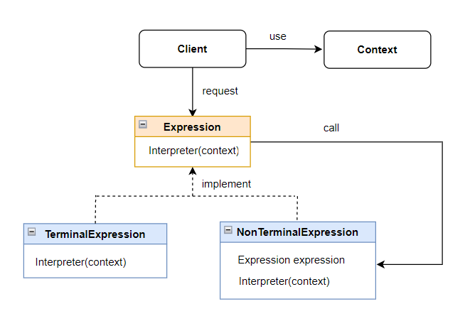 - NonterminalExpression: Có thể chứa TerminalExpression bên trong và cũng có thể chứa một NonterminalExpression khác. Nó đóng vai trò như là “ngữ pháp” của ngôn ngữ đặc tả.