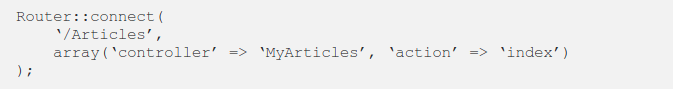 Tuy nhiên, "routes.php" (app/Config) có thể sửa đổi để định nghĩa routes tùy chỉnh. Ví dụ như trên, nếu ta muốn MyArticles là đường dẫn mặc định ta sẽ cấu hình trong routes.php như sau: