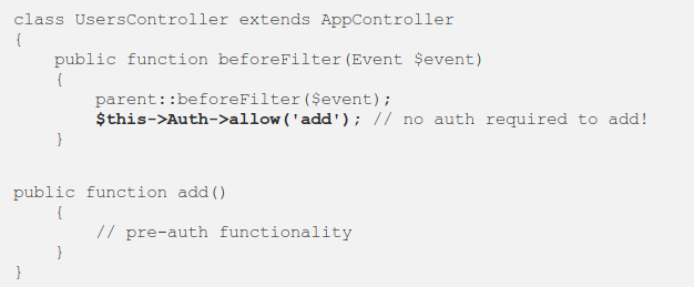 Trong tài liệu có đề cập đến các callback methods, trong đó có beforeFilter - method được gọi trước tất cả các action trong Controller. Method này được sử dụng trong AuthenticationComponent để cho phép một action được truy cập công khai. Ví dụ: định nghĩa method sau đây sẽ cho phép truy cập action mà không cần phải xác thực (Authorization)