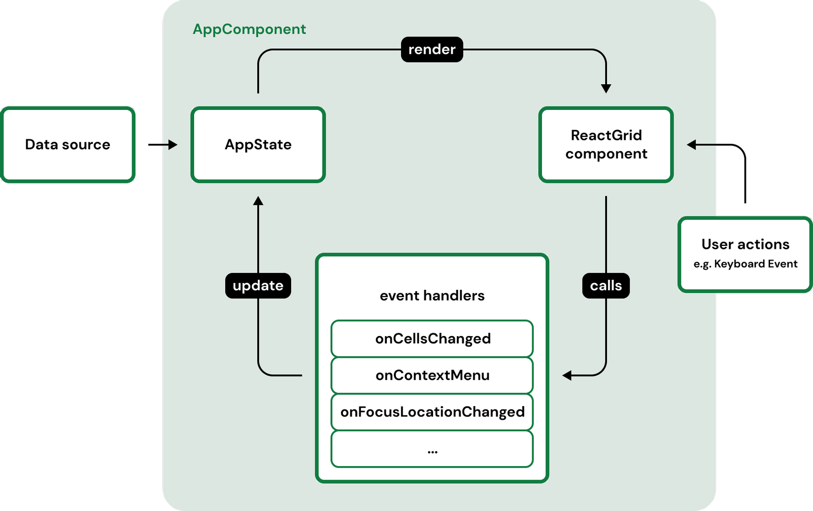 Render view đã sẵn sàng để xử lý các sự kiện đến từ người dùng, ví dụ: các thay đổi trong trình chỉnh sửa ô. Tuy nhiên, component vẫn hoạt động ở chế độ readonly vì cần cập nhật dữ liệu để thay đổi các nội dung. Ví dụ, chúng ta có thể làm điều này bằng cách triển khai Hàm onCellsChanged (ví dụ đến từ các tài liệu ReactGrid).