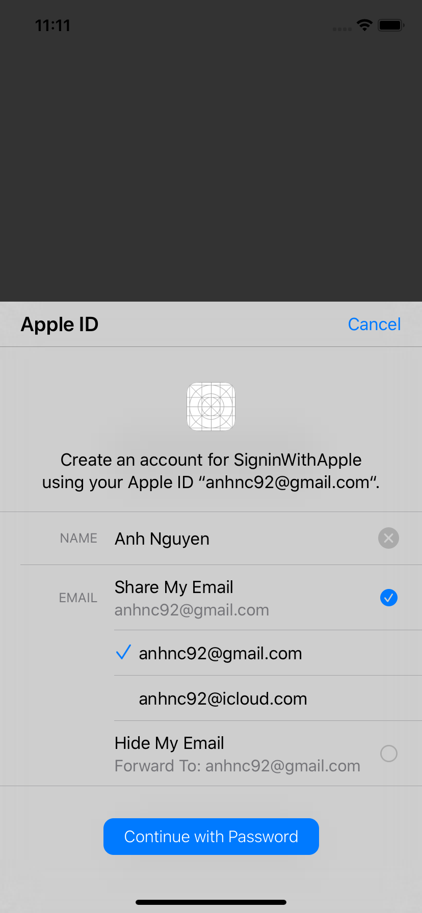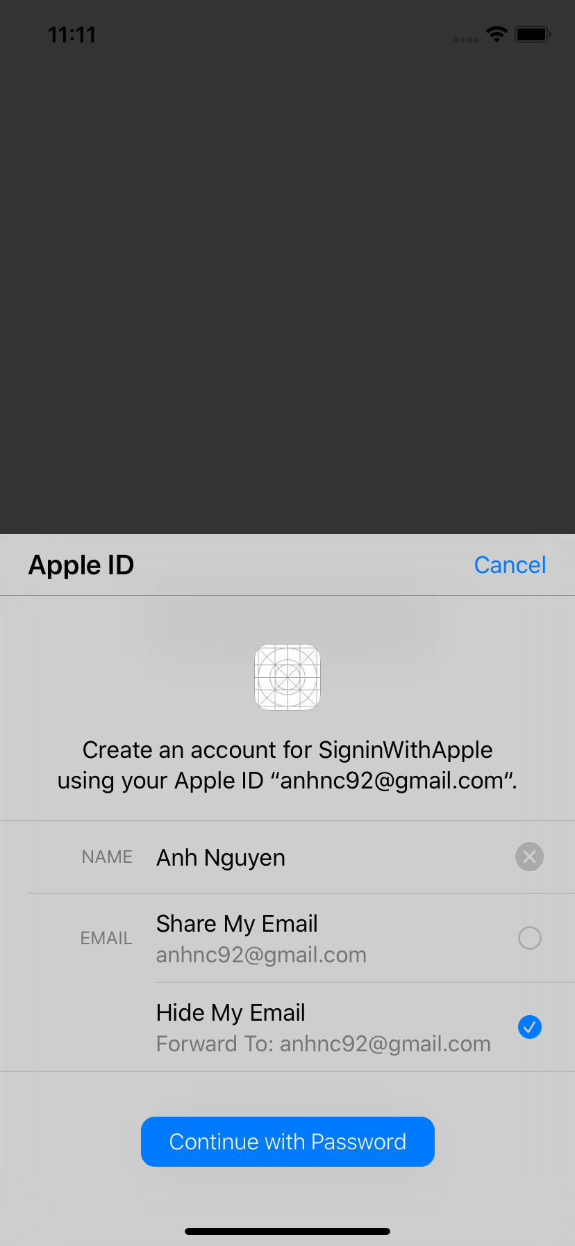 Sau khi click vào button Sign In With Apple, thì lúc này chúng ta sẽ có 2 lựa chọn sử dụng email của Apple ID hoặc sử dụng email ẩn danh Apple sẽ sinh ra random cho chúng ta để ta thực hiện việc Sign In vào hệ thống của ứng dụng. Ở đây ví dụ tôi test case sử dụng email Random khi việc Sign In With Apple thành công nó sẽ trả về userIdentifier = 001092.d7fd03fa74fe442d8e23d5bbfa330ef8.1604 và một email = wtjpjtf5rt@privaterelay.appleid.com, thông tin email của chúng ta hoàn toàn được bảo vệ. Và điều đặc biệt ở đây, khi bạn sử dụng email ẩn danh kia đăng kí account với ứng dụng, tất cả các email gửi về email đó sẽ đều foward đến email thật của chúng ta, thật vi diệu phải không nào!