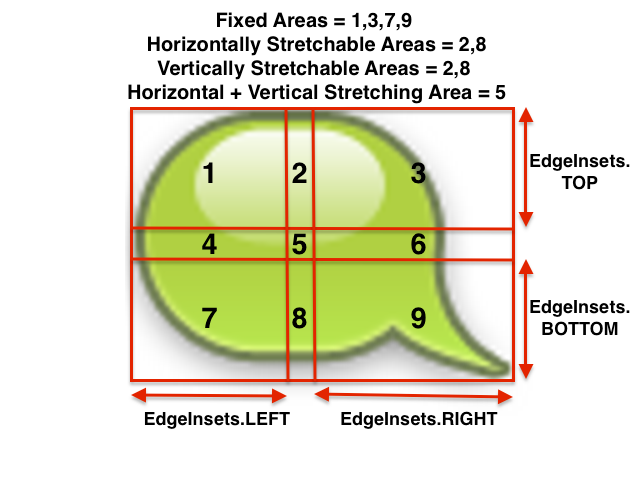 Để mà tạo ra được ảnh lớn từ một ảnh nhỏ thì ảnh nhỏ (origin) sẽ được chia thành 9 phần như hình ở trên. Những phần được chia này sẽ phụ thuộc vào tham số mà bạn truyền vào (UIEdgeInset) ban đầu.