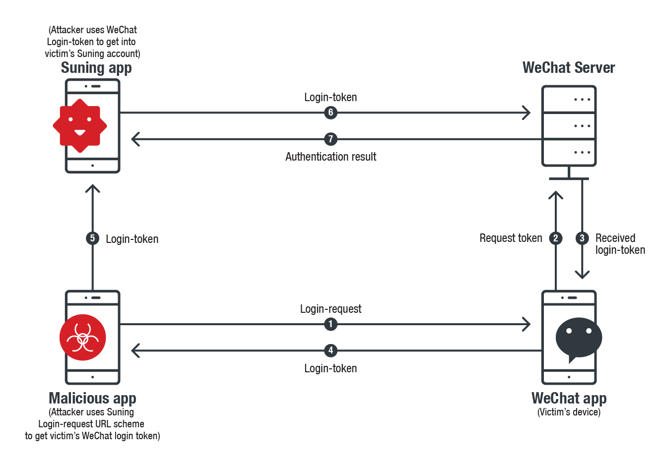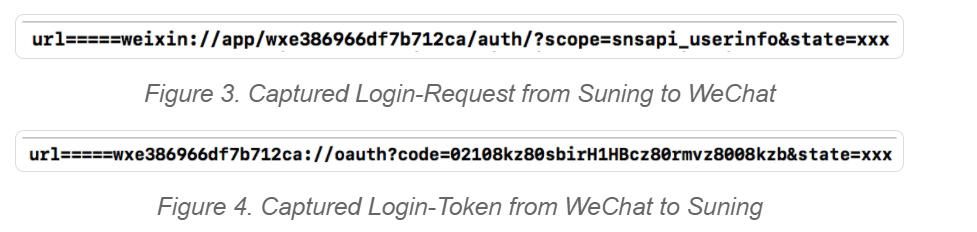 Tuy nhiên, trong quá trình gửi login-request (1), Wechat không xác thực nguồn gửi của request này. Ngoài ra, Suning sử dụng cùng một scheme cho request này. Theo đó, kẻ tấn công có thể sử dụng URL scheme này để gửi login request tới Wechat để lấy login token rồi sử dụng token này để lấy được thông tin của người dùng.