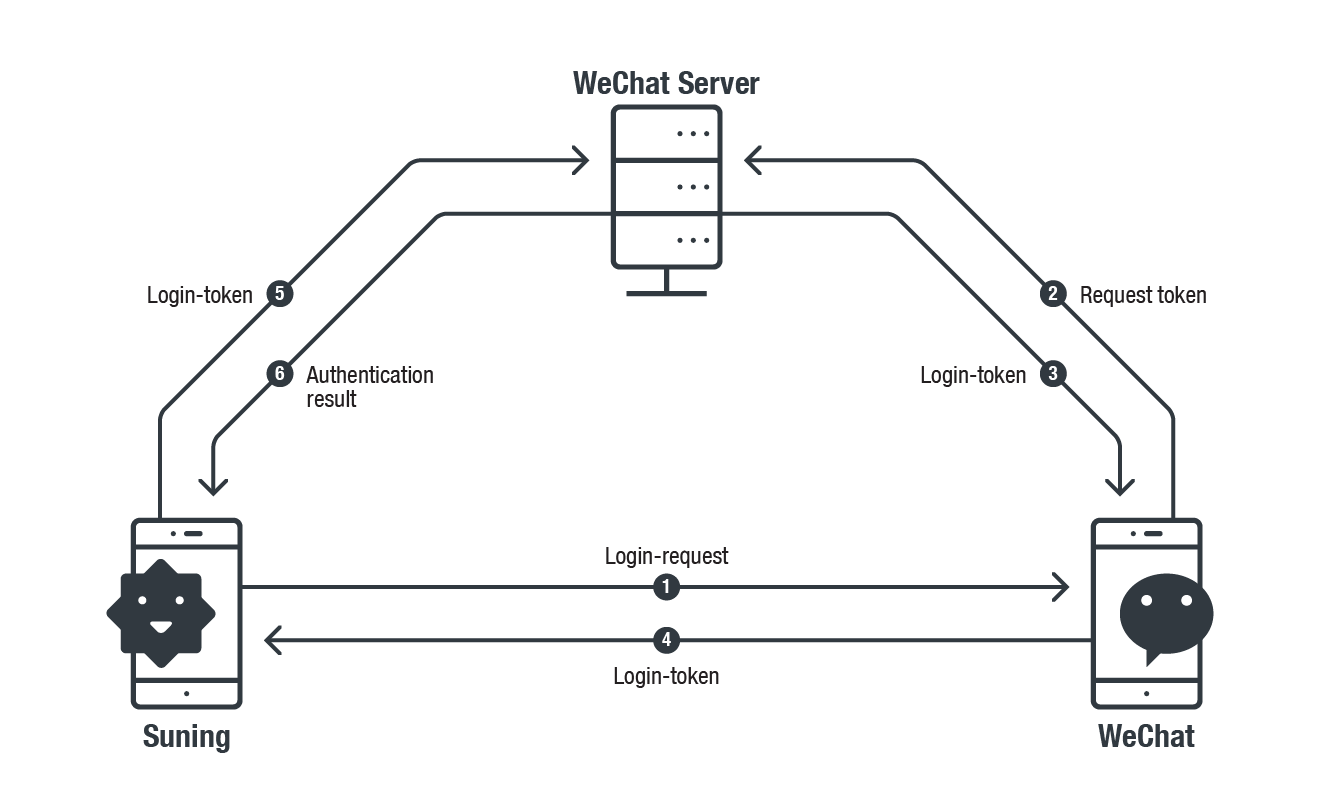 Đầu tiên, ứng dụng Suning gửi một yêu cầu đăng nhập tới Wechat (1). We chat sẽ gửi một request token lên Wechat server (2) và nhận về một login-token (3). Token này sẽ được gửi lại cho Suning (4) để Suning thực hiện xác thực với Wechat server (5) (6).