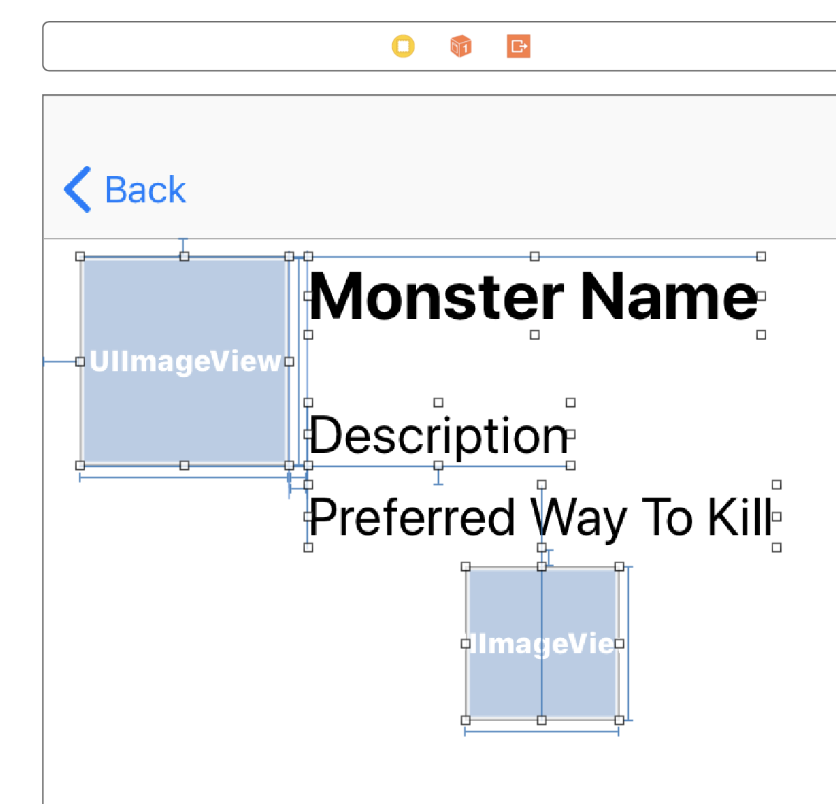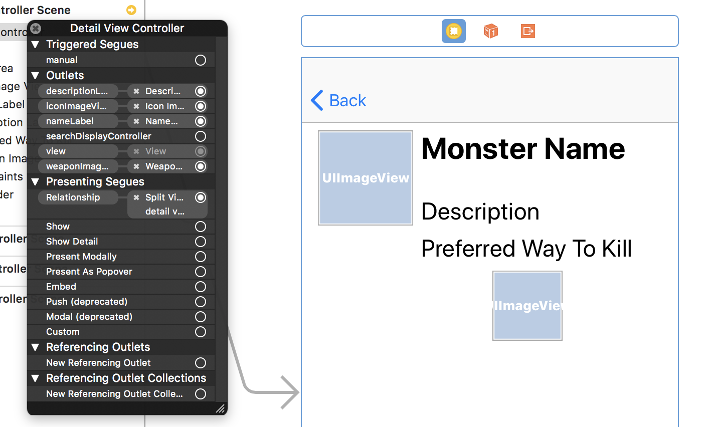Tại đây, bạn đã thêm các thuộc tính cho các thành phần UI khác nhau mà bạn vừa thêm trong màn Detail. Bạn cũng đã thêm một thuộc tính cho đối tượng Monster mà view controller này sẽ hiển thị.
