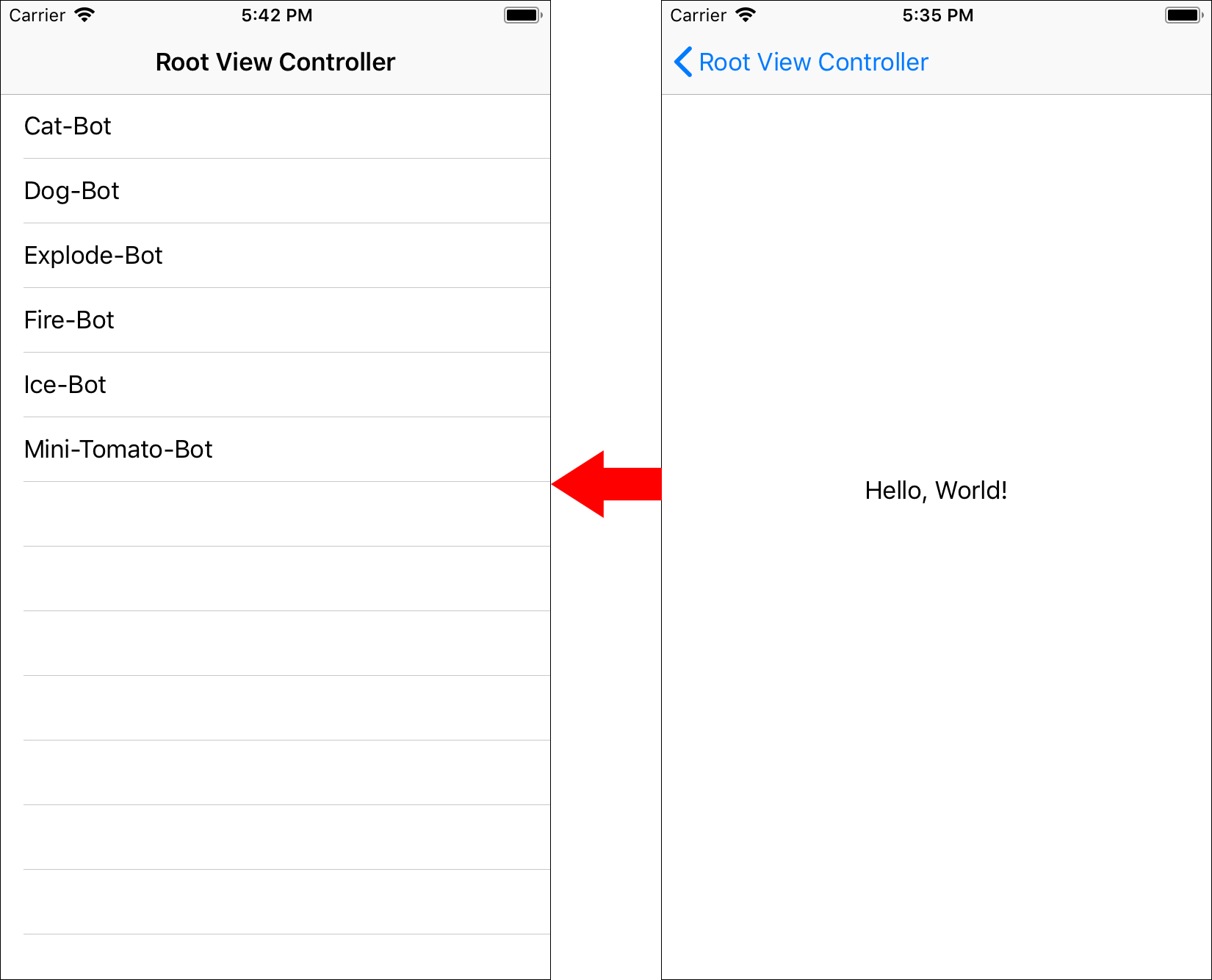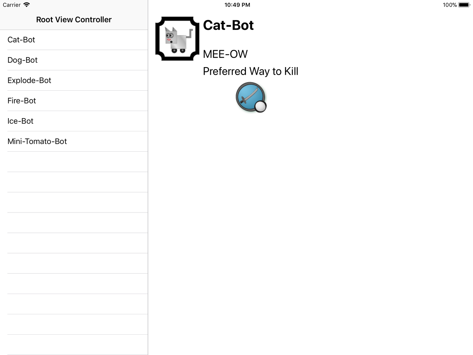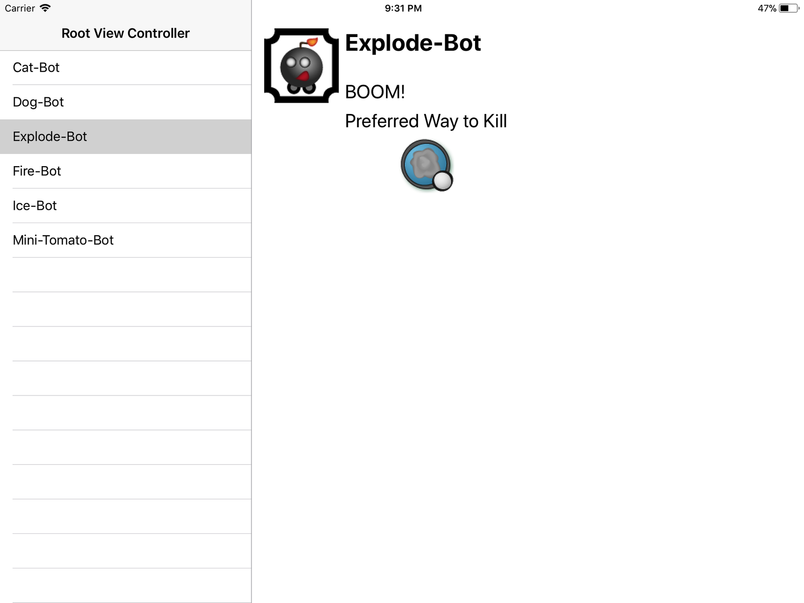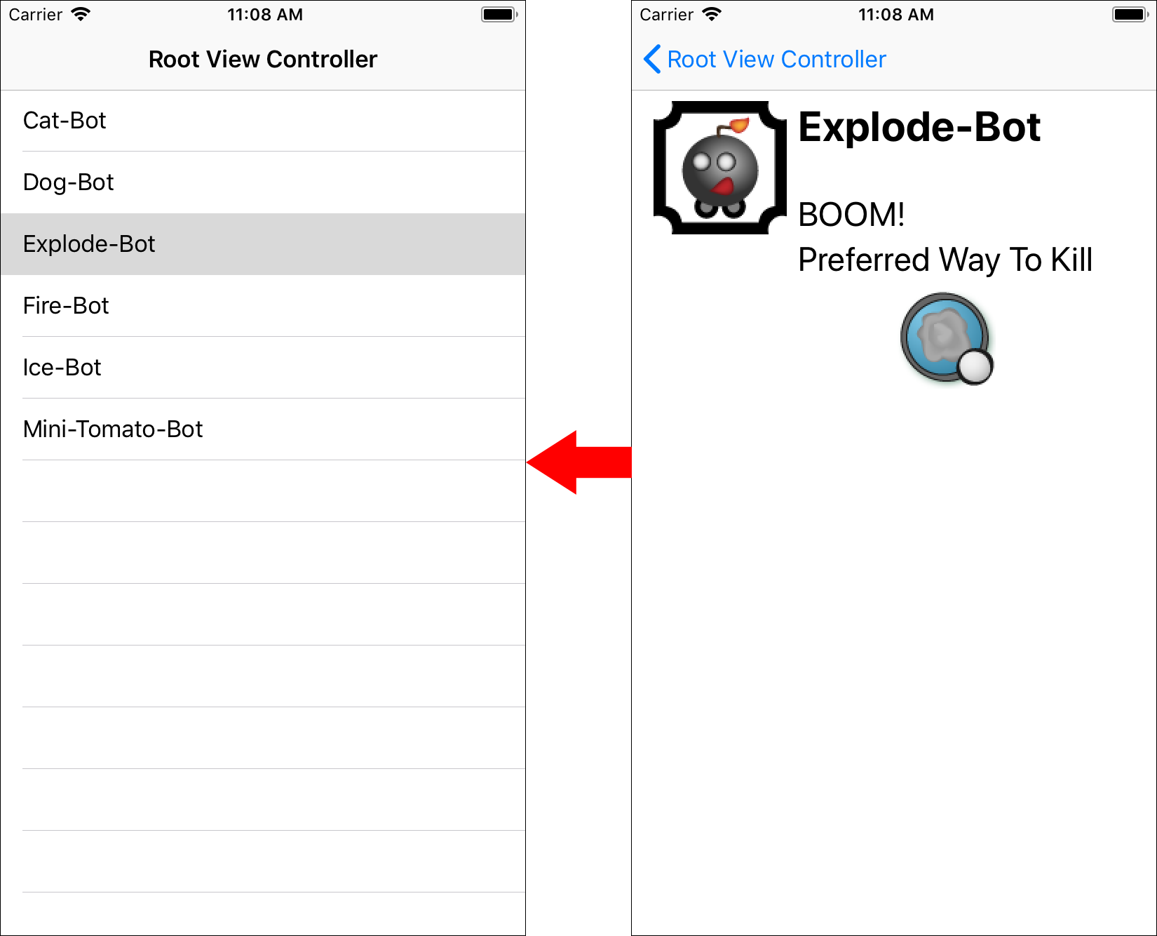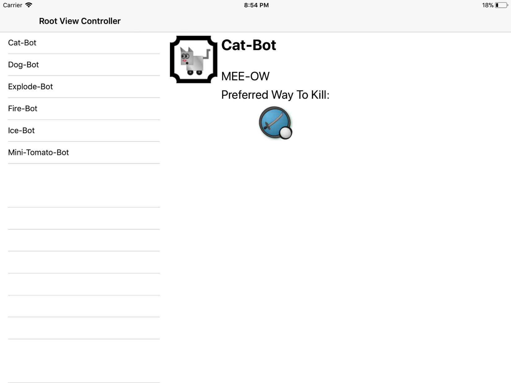 đó là do việc chọn một quái vật khác trên màn MasterViewController vẫn chưa có thay đổi gì và bạn đã bị mắc kẹt với Cat-Bot mãi mãi. Đó là những gì bạn sẽ xử lý tiếp theo!