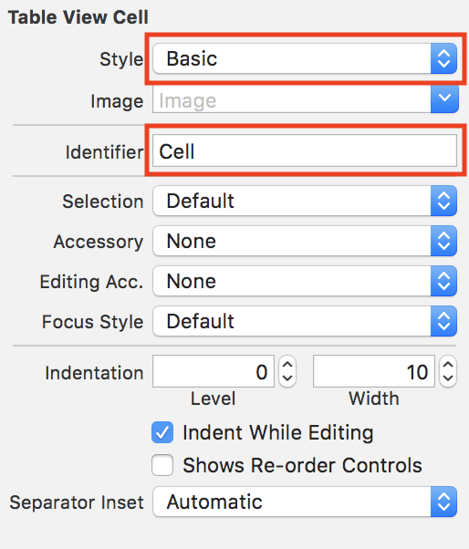 Bên trong màn Master View Controller, chọn Prototype Cell và thay đổi Identifier thành Cell. Thay đổi cell Style thành Basic.
