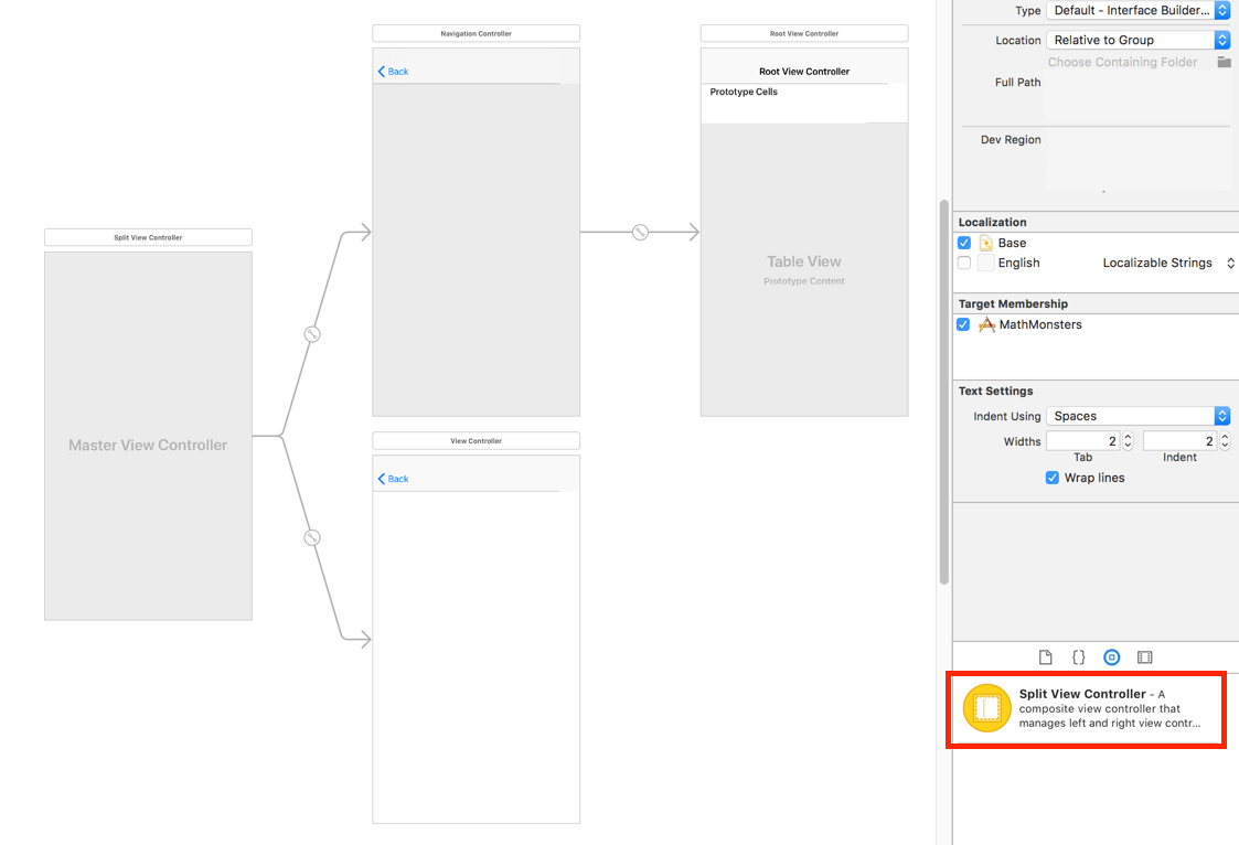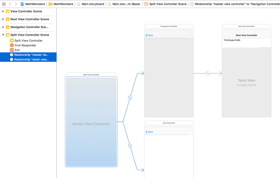 Một Split view controller có một thuộc tính viewControllers mà có Master view controller và Detail view controller bên trong. MasterViewController trong trường hợp của bạn thực ra là bộ điều khiển điều hướng, vì thế cho nên bạn phải thiết lập màn MasterViewController lên đầu. Từ đó, bạn mới có thể cho nó hiển thị danh sách quái vật đầu tiên để điều hướng sang màn chi tiết quái vật.