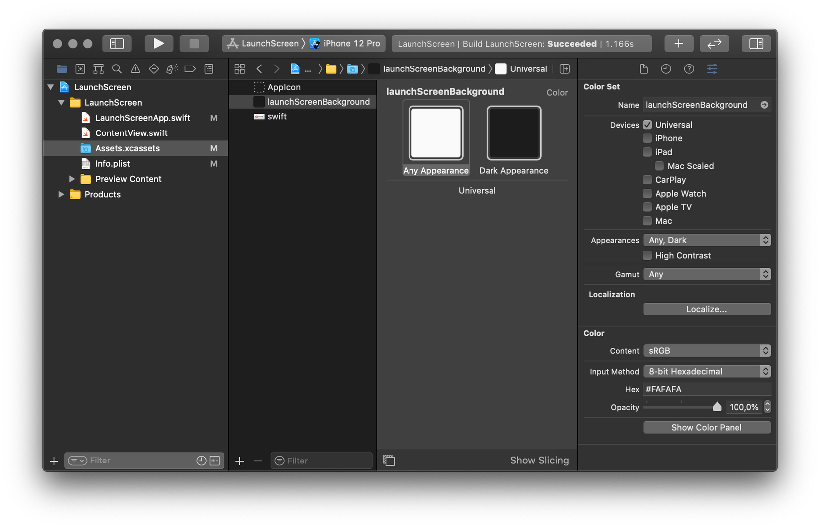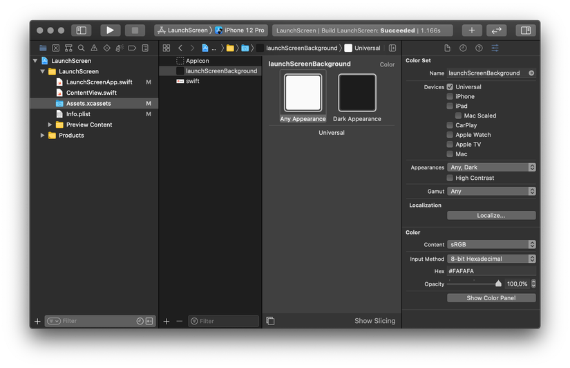 Đầu tiên, chúng ta có thể thay đổi backgroundColor cho Launch Screen. Đây là giá trị String của tên màu từ Asset catalog. Mặc định, iOS đang sử dụng màu systemBackground. Hãy thêm Color Set mới vào Asset catalog và đặt tên cho nó là launchScreenBackground: