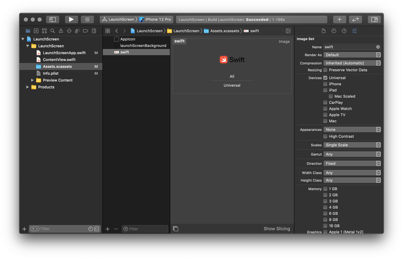 Bây giờ chúng ta có thể thêm ảnh trên vào Info.plist trong Launch Screen dictionary bằng cách sử dụng key Image Name. Với việc set Image respects safe area insets là YES, chúng ta chắc chắn rằng nó cân chỉnh chính xác và không vượt ra ngoài safe area. Image ở định dạng SVG và tỷ lệ hoàn hảo mà không làm giảm chất lượng hình ảnh. Bây giờ khi khởi chạy ứng dụng, chúng ta có thể thấy màu nền và logo Swift ở trên nó.