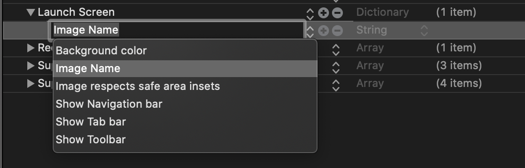 Tất cả các thiết lập được thực hiện trong tệp Info.plist, chúng ta có thể thấy rằng Xcode 12 sẽ tạo sẵn cho chúng ta key Launch Screen với một kiểu Dictionary, và chúng ta có một vài tuỳ chọn trong Dictionary đó.