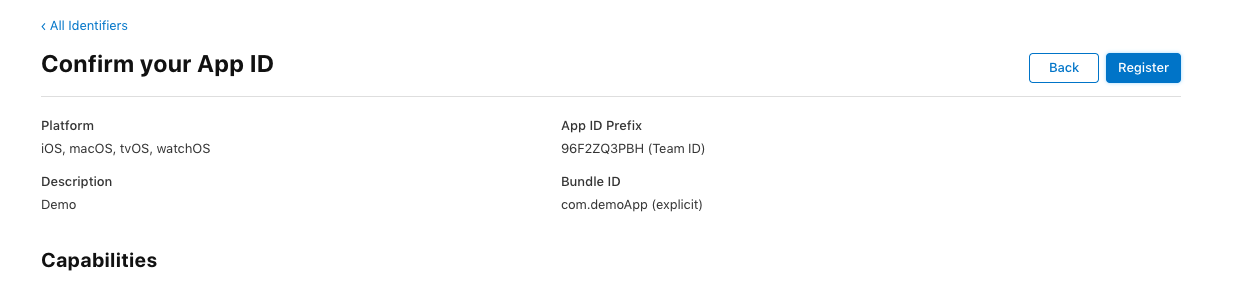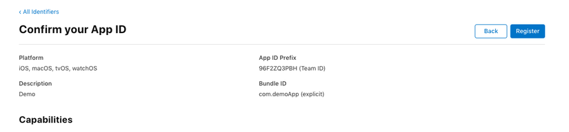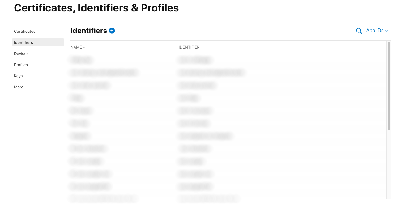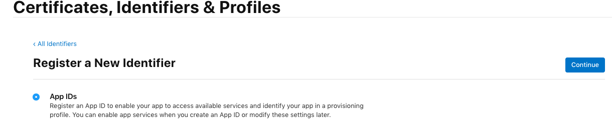 - Quay trở lại developer account và chọn ứng dụng của bạn đã tạo khi nãy trong list Identifiers.
