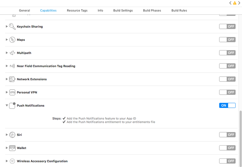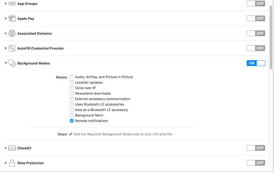 - Enable push capability: cho phép push notifications & remote notificaton trong YourProject -> Target -> Capabilities.