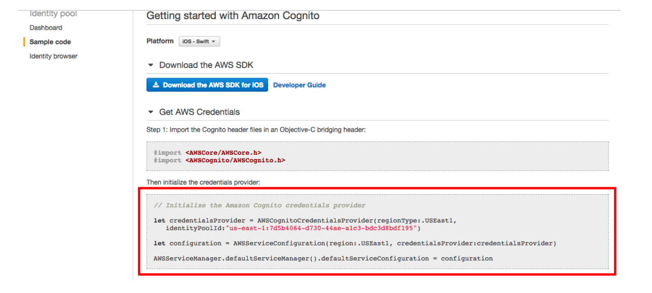 regionType: AWSRegionType.USEast1, identityPoolId: “us-east-1:7d5b4064-d730–44ae-a1c3-bdc3d8bdf195”)