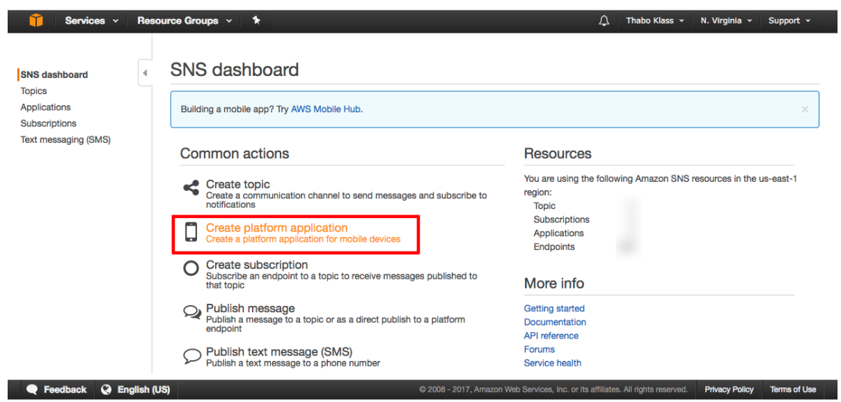 - Create a new platform application: Đăng nhập vào AWS của bạn và chuyển đến bảng điều khiển SNS. Lựa chọn ' Create platform application '