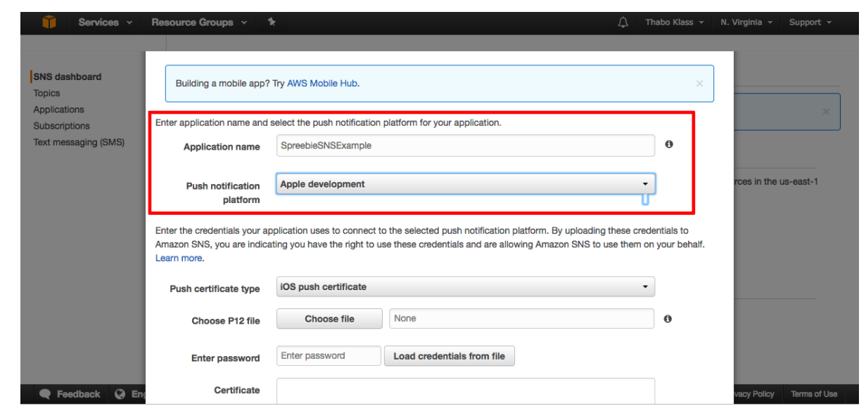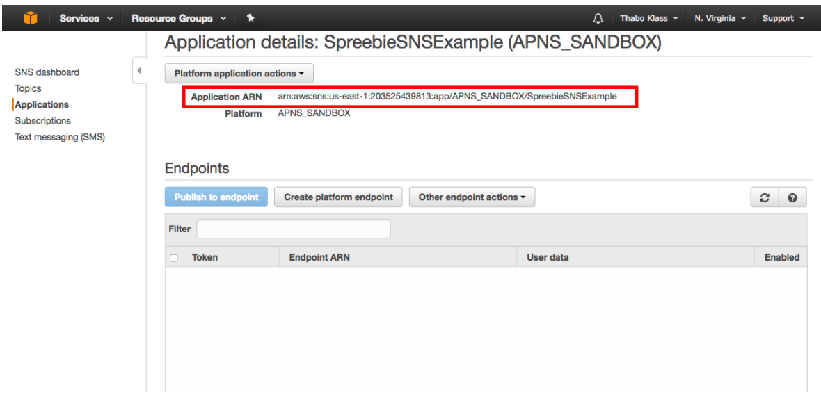 let SNSPlatformApplicationArn = “arn:aws:sns:us-east-1:203525439813:app/APNS_SANDBOX/SpreebieSNSExample”