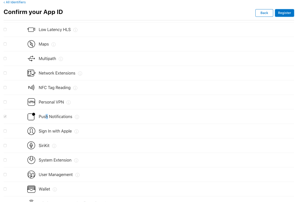 Tạo ID ứng dụng của bạn, kích hoạt push notification và file p12 cho ứng dụng mới của bạn.