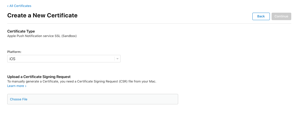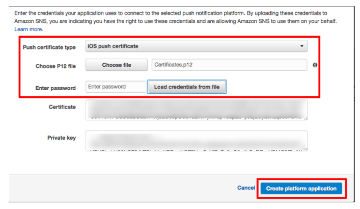 Push certificate type: chọn ' iOS Push Certificate ' . Chọn ' Choose file ' và chọn tệp chứng chỉ P12 bạn đã tạo. Nhập mật khẩu của bạn nếu bạn đã tạo certificate. Nếu bạn không có mật khẩu, hãy để trống. Khi mọi thứ hoàn tất, hãy nhấp vào nút 'Create platform application '.