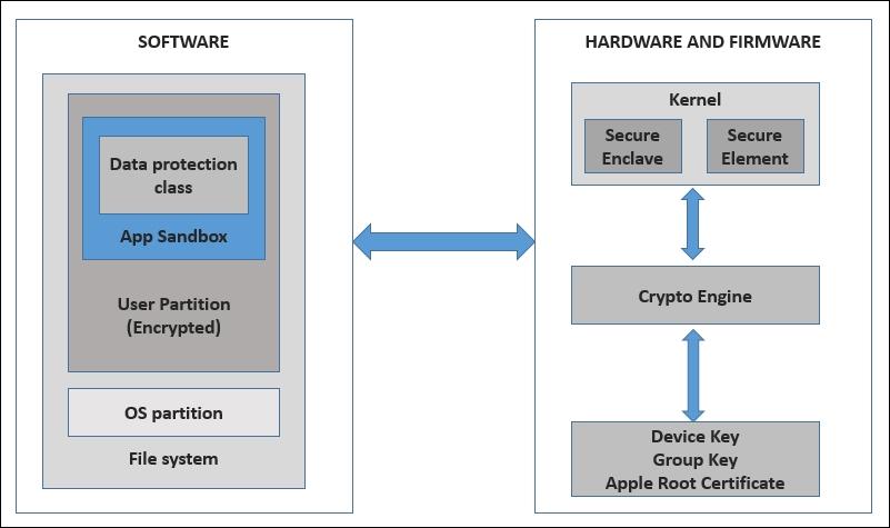 Như từ hình trên có thể thấy, mỗi app sẽ được chạy trong một sandbox riêng của mình. Trong đó có một lớp bảo mật dữ liệu (Data protection class). Các sandbox này sẽ nằng trong phân vùng của người dùng. Các dữ liệu trong vùng này sẽ được áp dụng các thuật toán mã hoá của iOS. Phân vùng này là một phần của file system bên cạnh phân vùng hệ điều hành. Ngoài ra, việc bảo mật phần cứng và firmware của iOS cũng rất được chú trọng. Như việc sử dụng các secure enclave và secure element trong kernel, các crypto engine - thứ duy nhất truy cập được tới các khoá mã hoá của hệ thống. Cùng với đó, ở sâu nhất của hệ thống sẽ là các khoá thiết bị và khoá group sẽ nói tới ở phần sau cùng chứng chỉ root của Apple (Apple Root Certificate).