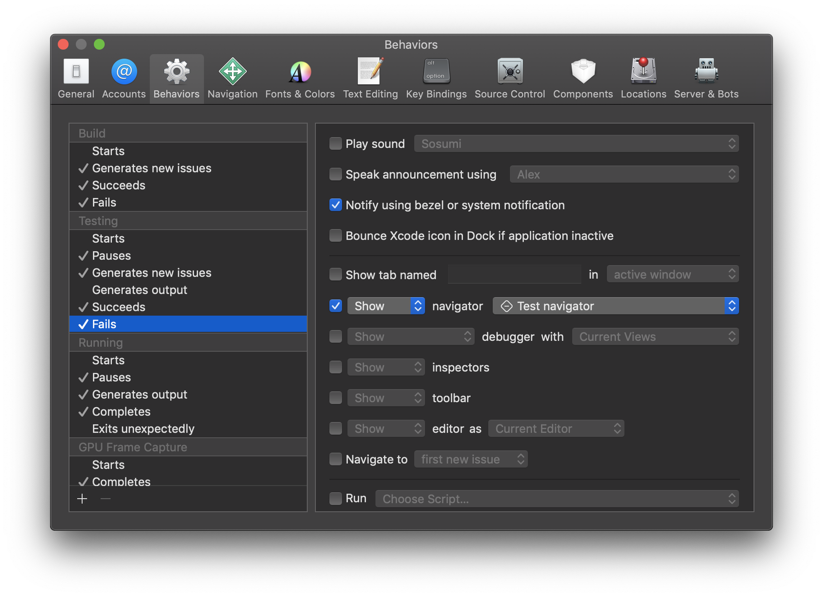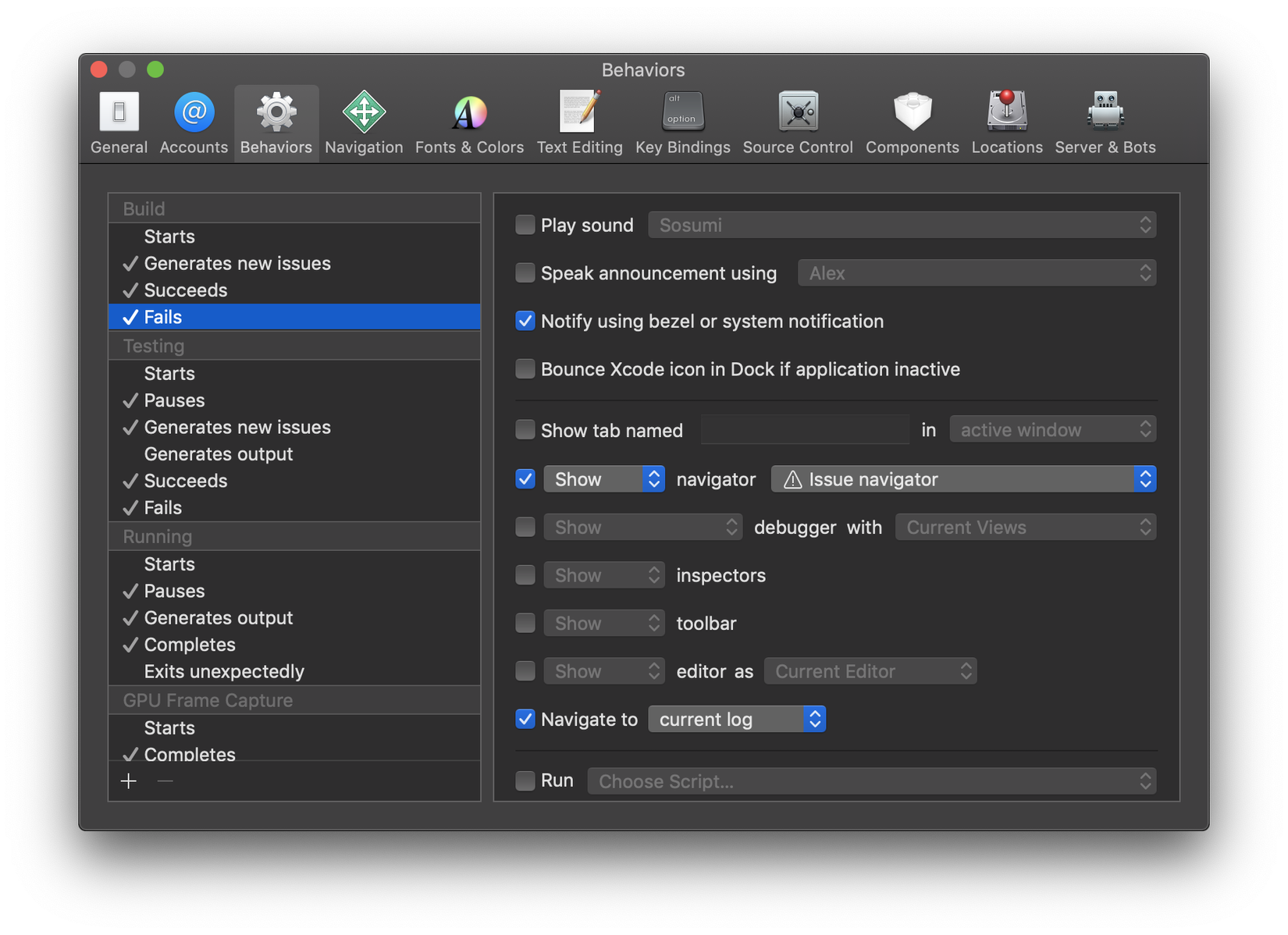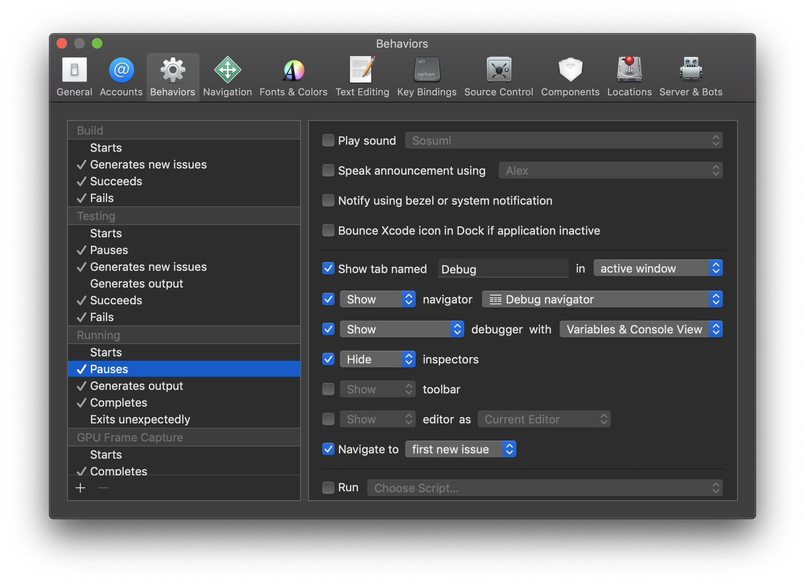 Xcode Behaviors có thể thay đổi cách Xcode phản ứng với các sự kiện nhất định. Các hành vi mặc định giúp bạn bằng cách hiển thị ví dụ trình điều hướng gỡ lỗi khi nhấn điểm dừng, nhưng chúng có thể tăng tốc cho bạn nhiều hơn nữa. Một danh sách các behaviors không được bật theo mặc định, điểm bắt đầu là tab behavior có thể được tìm thấy trong các tùy chọn Xcode có thể được mở bằng