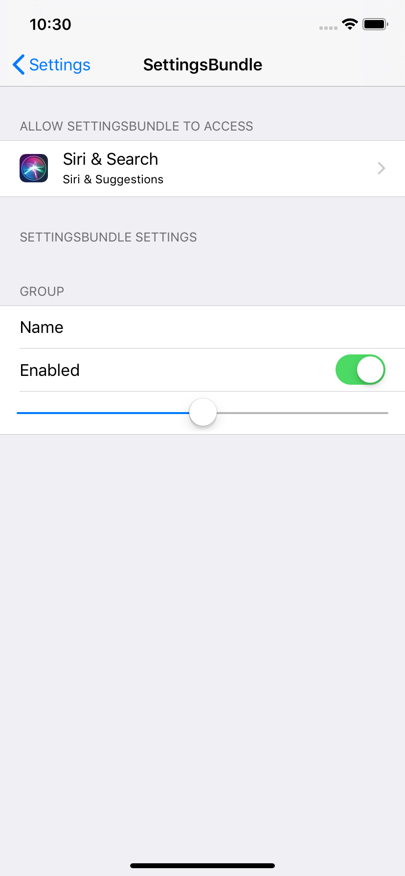 Sau khi file Settings.bundle được tạo, tiến hành build và run app. Trong app Setting của hệ điều hành sẽ xuất hiện ứng dụng của chúng ta, sau khi chọn thì sẽ xuất hiện một menu với một vài mục mặc định như sau: