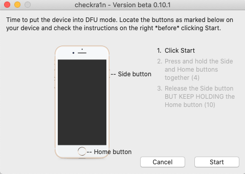 Chọn start và làm theo hướng dẫn. Việc còn lại hãy để checkra1n lo.
