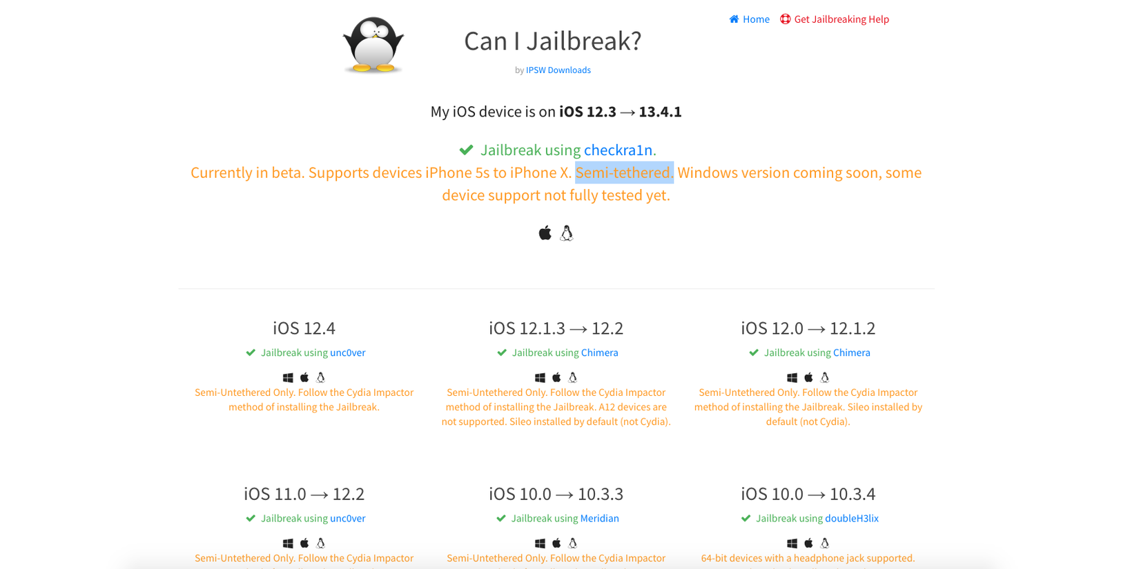 Jailbreak là một công việc hết sức phức tạp và khó khăn. Tuy nhiên, cảm ơn các nhóm nghiên cứu về jailbreak khi mà họ cung cấp cho chúng ta các công cụ để tiến hành việc jailbreak dễ dàng và hết sức đơn giản. Các công cụ này có thể tìm thấy trên trang chủ của các team. Tuy nhiên, chúng ta có thể truy cập vào Can I Jailbreak nơi sẽ có các bản cập nhật mới nhất cho các công cụ jailbreak của rất nhiều tổ chức như checkra1n, unc0ver, Chimera,...
