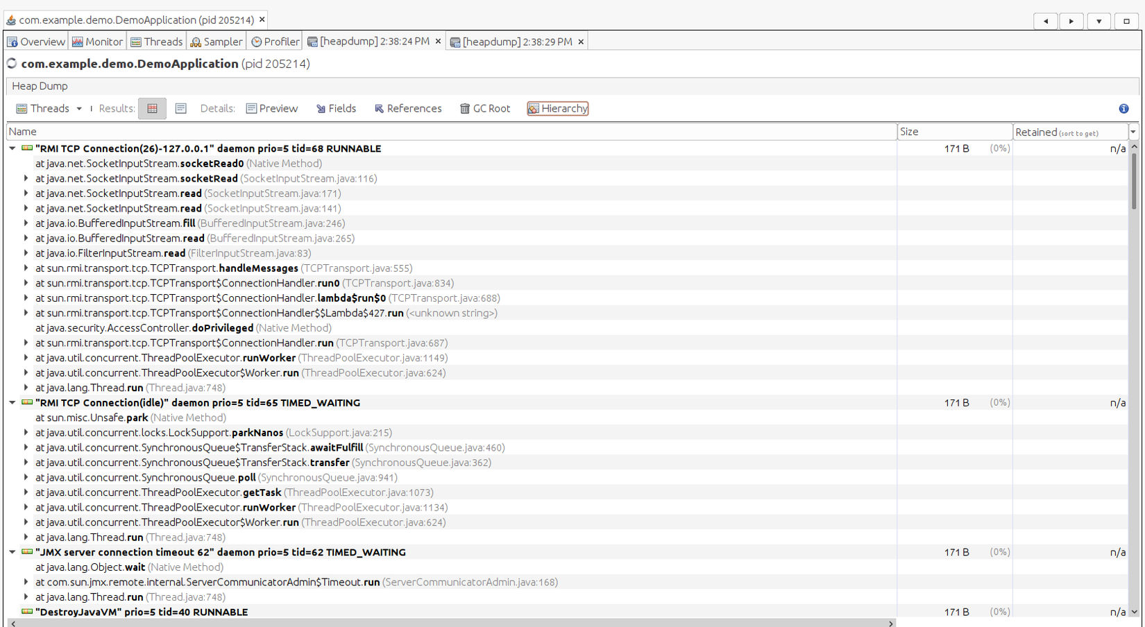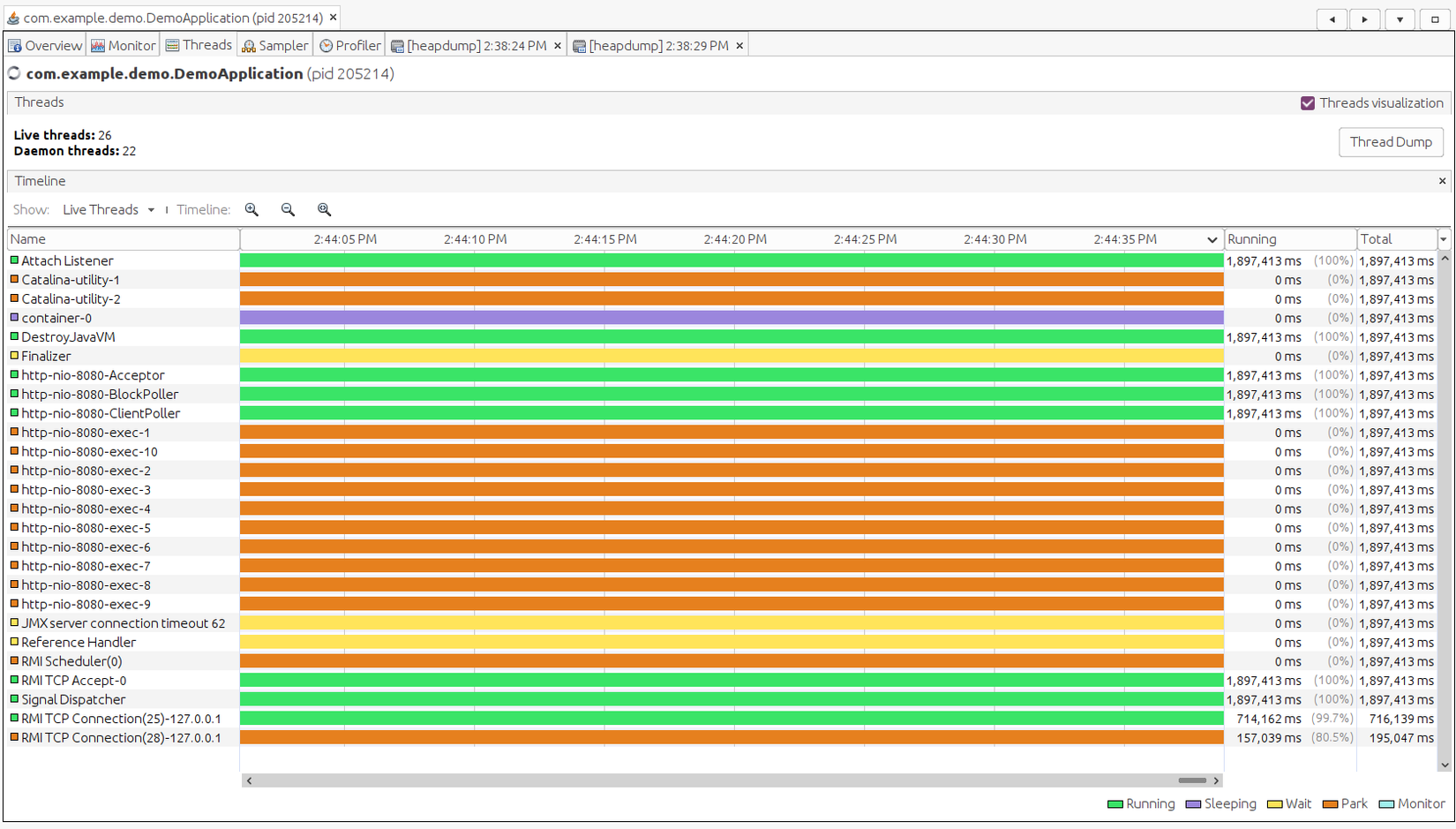 Nó liệt kê cho ta thấy số lượng threads và trạng thái các thread đó theo từng màu: Running, Sleeping, Wait, Park....