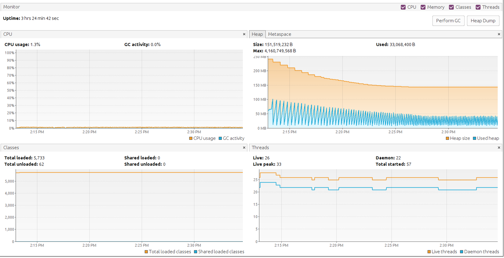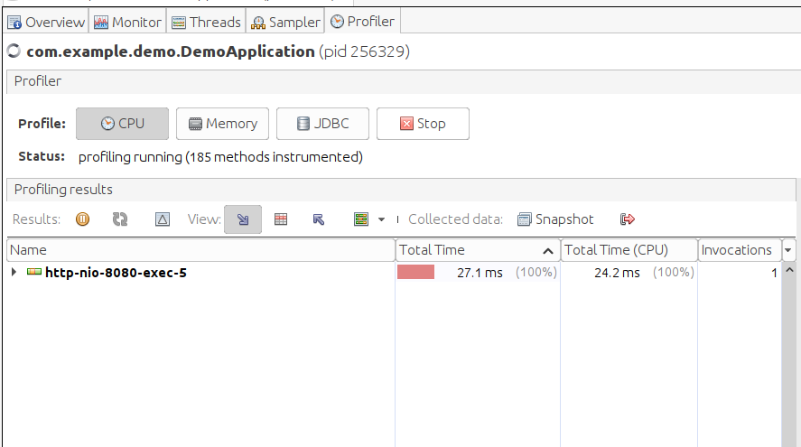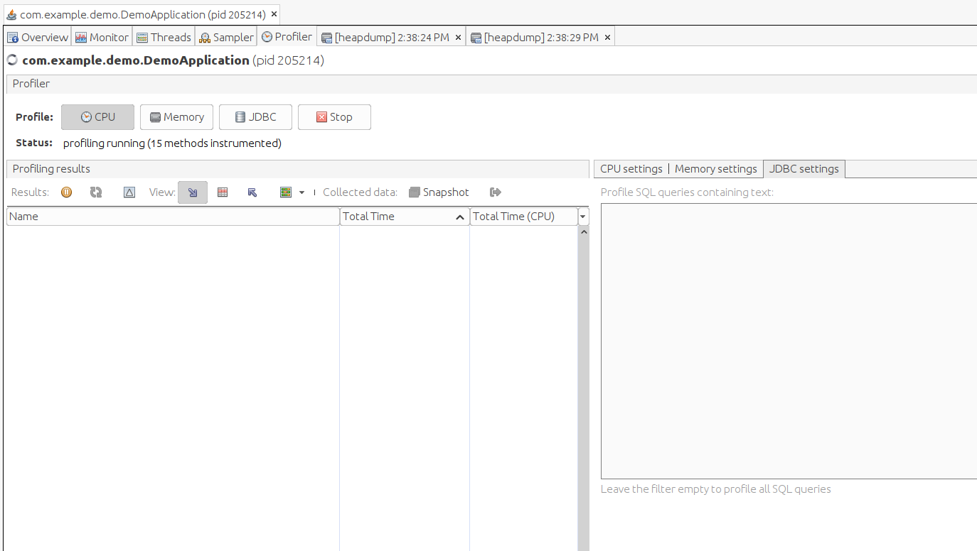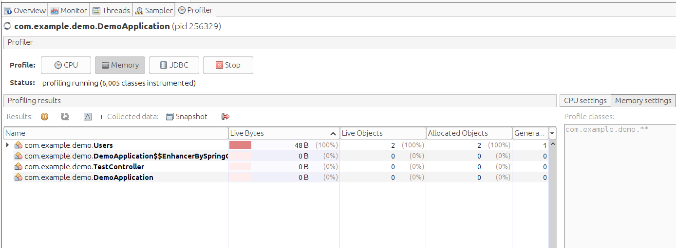 Chúng ta có thể quan sát trạng thái CPU, Memory, Classes, Threads Nó là Live Monitoring , chúng ta có thể quan sát các thông số, thao tác trên ứn dụng, xem các thao tác nào ảnh hưởng đến các thông số. Thao tác gì tốn CPU, tăng RAM, tăng Thread, số lượng Classes.