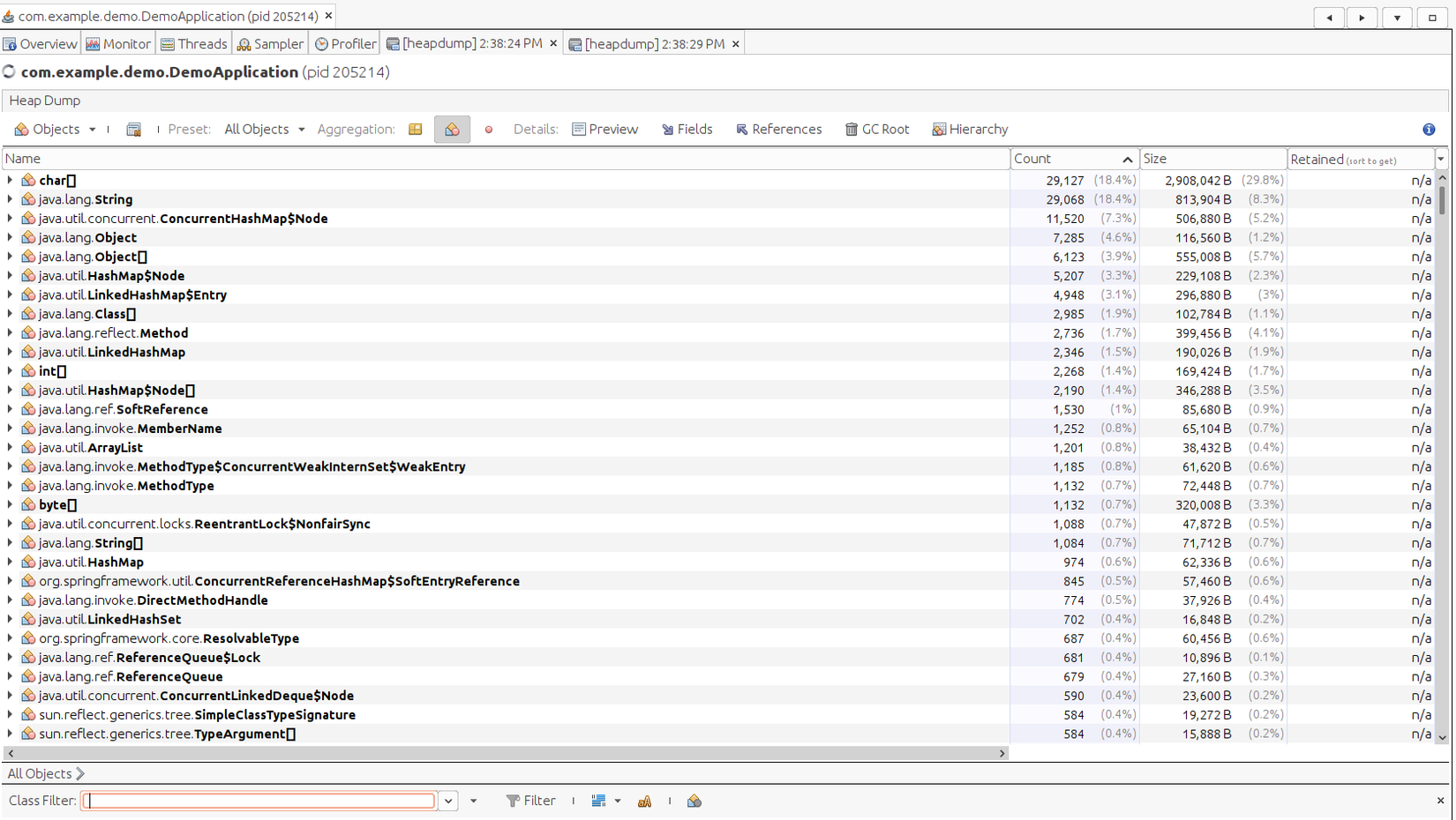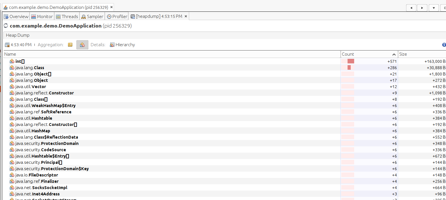 Tool cũng hỗ trợ compare 2 file dumps tại 2 thời điểm khác nhau, xem số lượng class, thread thay đổi.