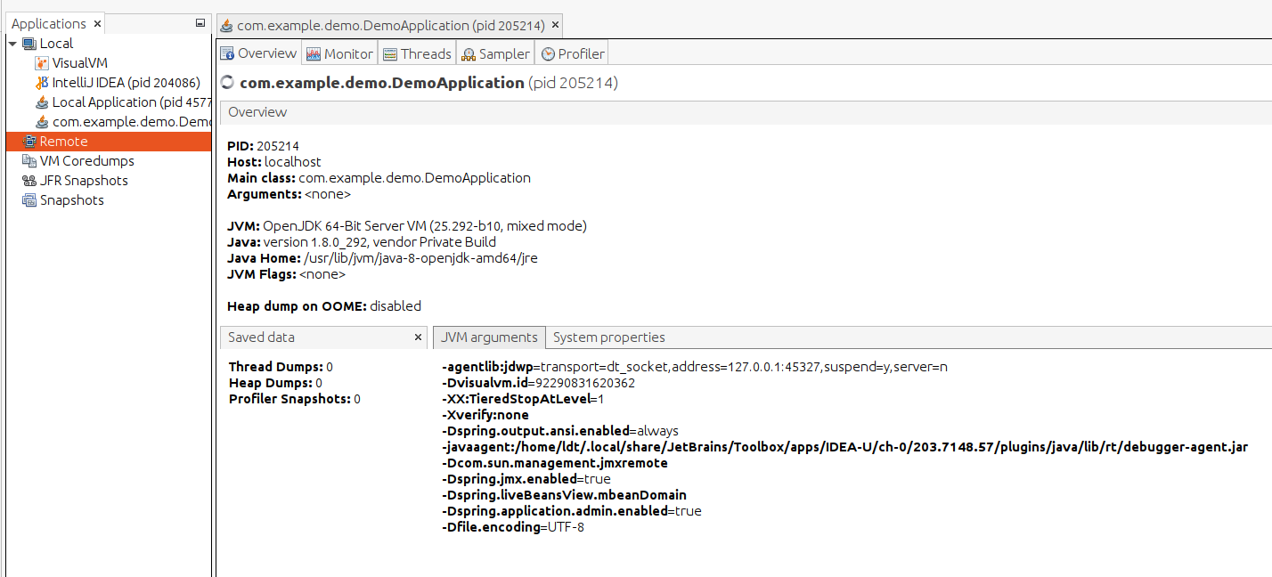 - Remote: Mình có thể connect đến 1 máy khác để theo dõi các ứng dụng chạy trên máy đó. Ban đầu bạn phải chạy ứng dụng enable JMX remote và connect theo thông số JMX đó