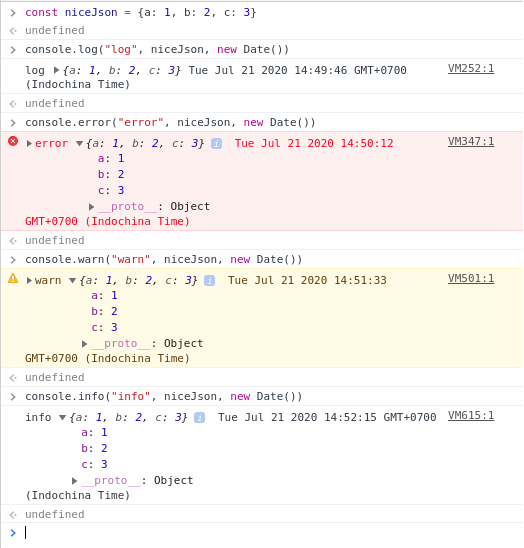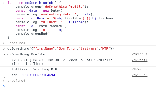 Method này cho phép bạn nhóm các console.log (hoặc error, info... ) thành một nhóm. Cú pháp của nó rất đơn giản: đặt tất cả các dòng console.log mà bạn muốn nhóm dưới một dòng console.group() (hoặc console.groupCollapsed() nếu bạn muốn nhóm được mặc định là đóng vào). Sau đó đặt một dòng console.groupEnd() ở vị trí cuối các log mà bạn muốn nhóm.