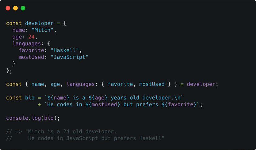 Trong ví dụ trên ta có thể thấy mảng hoặc object sẽ được nằm bên bên trái (left-hand side - LHS) của phép gán, và nó đóng vai trò để phân tách các giá trị của mảng hoặc object thành từng phép gán riêng biệt nằm bên trái. Chúng ta sẽ đi chi tiết về Destructuring để xem còn làm được những gì với nó nữa nhé.