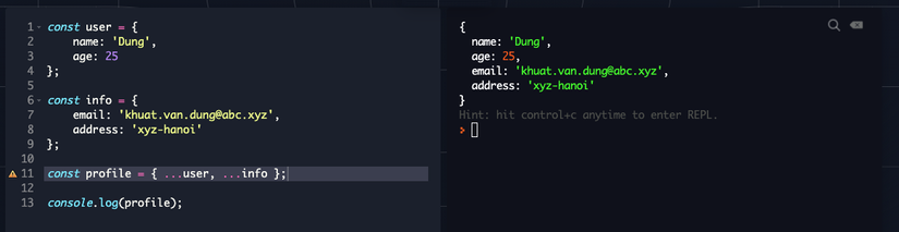 Lúc này, trong trường hợp mình muốn gộp 2 object này lại, mình hoàn toàn có thể thực hiện như sau: