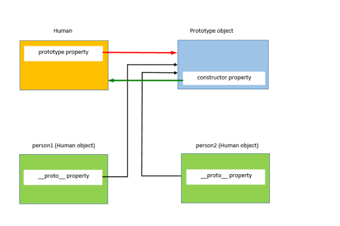 Dựa vào kết quả trên có thể thấy thuộc tính __proto__ của person1, person2 trỏ đến cùng prototype object của Human