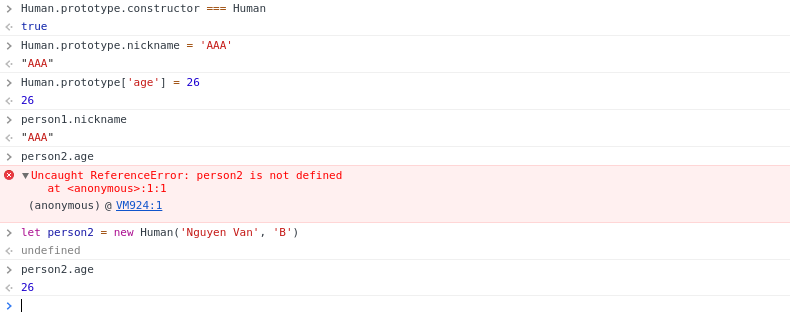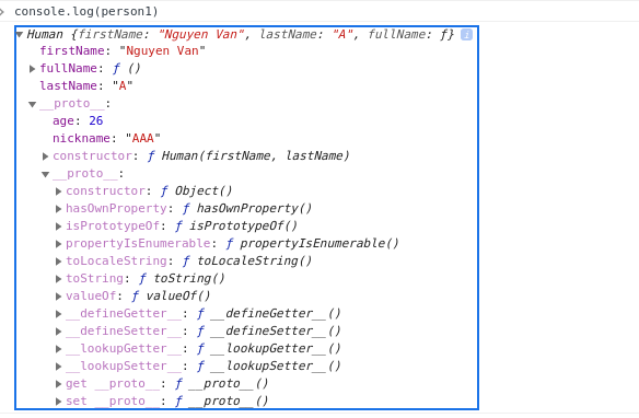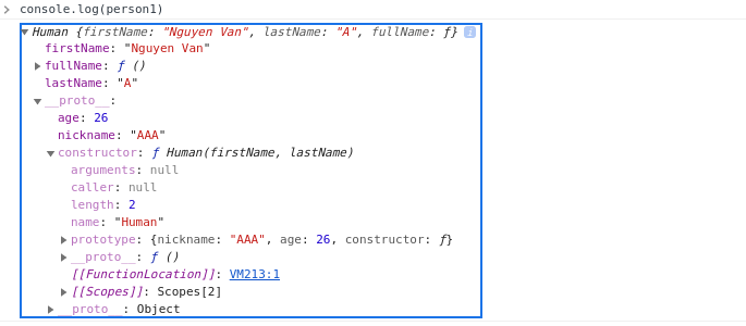 Có thể thấy person1 có thuộc tính __proto__ trỏ đến prototype của Human và nó đã chứa 2 thuộc tính age, nickname mà ta vừa thêm cho prototype của Human